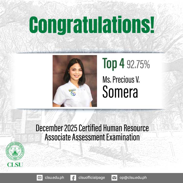 Central Luzon State University (CLSU) has once again demonstrated its academic prowess, as Ms. Precious V. Somera, a fourth-year Bachelor of Science in Psychology student, ranked fourth in the December 2025 Certified Human Resource Associate (CHRA™) Assessment Examination, scoring 92.75%. Complementing this individual success, CLSU was named as a Top Performing School after recording a 94.44% institutional passing rate. The CHRA™ examination is a rigorous evaluation of key competencies in human resource management, conducted nationwide through both on-site and online modalities, and administered by the Human Resource Educators’ Association of the Philippines (HREAP). 1. Abaco, Jenny Rose Ferrer 2. Benedicto, Maureen Laurice Abuan 3. Caletoy, Chastine Kylle Maon 4. Danggalan, Michael Batang-I 5. Divino, Claierra May Laurencio 6. Doctor, Eloiza Ann Urbi 7. Enipto, Krystal Dane Aizel Almodovar 8. Fermin, Mary Lynn Camacho 9. Fernando, Cyriss Alynna Hiñosa 10. Julian, Aira Jem Santos 11. Montoya, Atasha Leigh De Roxas 12. Moratalla, Nadine Isabel Coloma 13. Ragel, Kate Aira Avenilla 14. Samson, Angelie Libunao 15. Sanchez, Odette Aganan 16. Somera, Precious Villafuerte 17. Tecson, Adrian Pertible 18. Urbano, Andrea Gwyneth Melana # SievingForExcellence