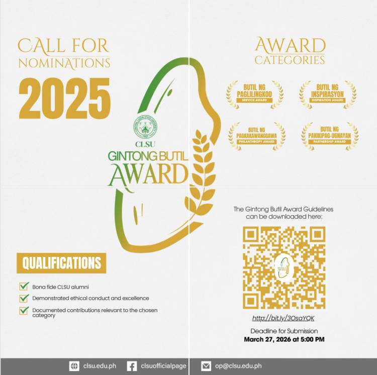 “The Seed of Excellence, Harvest of Impact” Central Luzon State University (CLSU) proudly launches the Gintong Butil Awards, the official alumni recognition program honoring distinguished CLSU alumni whose achievements reflect excellence, service, generosity, and meaningful collaboration. Just like a single grain that grows into a sustaining harvest, our alumni continue to transform knowledge into leadership, innovation into progress, and gratitude into lasting impact. We now call for nominations for the following award categories: Butil ng Paglilingkod — Service Award For alumni whose work uplifts communities and advances public welfare. Butil ng Inspirasyon — Inspiration Award For alumni whose excellence in science, technology, education, arts, sports, health, and other fields brings honor to CLSU. Butil ng Pagkakawanggawa — Philanthropy Award For alumni or alumni groups whose generosity strengthens CLSU and supports student success. Butil ng Pakikipag-ugnayan — Partnership Award For alumni who build impactful collaborations that expand CLSU’s reach and opportunities. For further details, please refer to the nomination guidelines and form found in this link: https://bit.ly/3OsaYQK Let us celebrate the harvest of excellence that began here at CLSU. Nominate a deserving alumnus or alumni group today. The awarding schedule will be announced at a later date and is set to take place during the Founding Anniversary Week celebration. #GintongButilAwards #CLSUAlumni #TheSeedOfExcellence #HarvestOfImpact