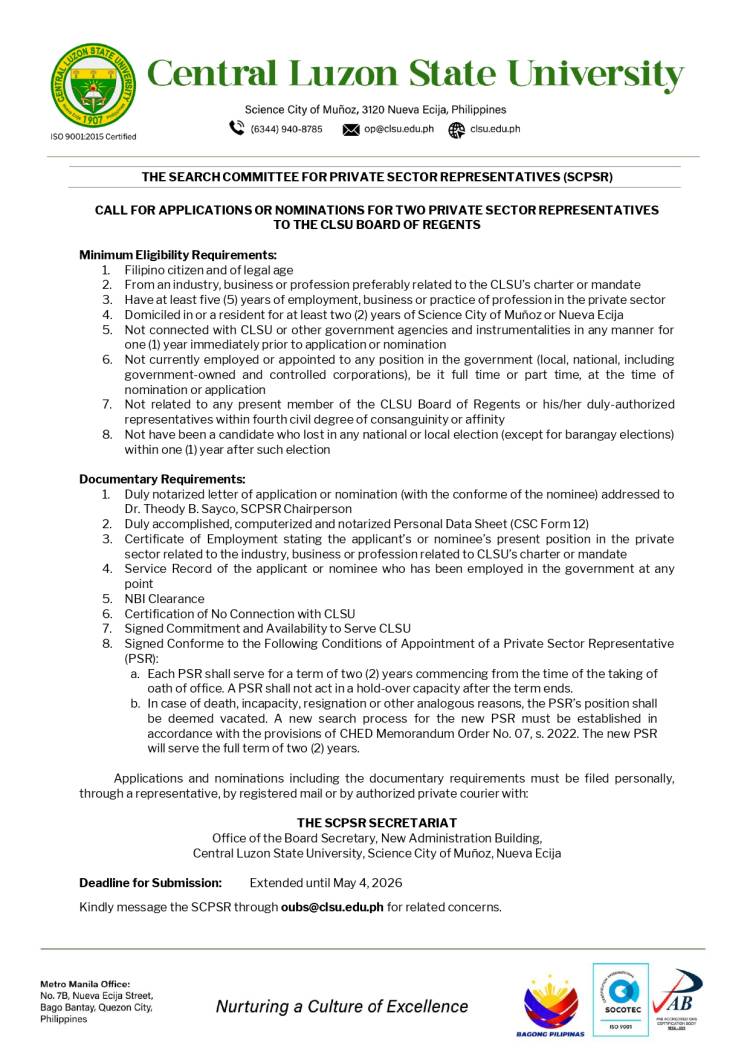 CALL FOR APPLICATIONS OR NOMINATIONS FOR TWO PRIVATE SECTOR REPRESENTATIVES TO THE CLSU BOARD OF REGENTS