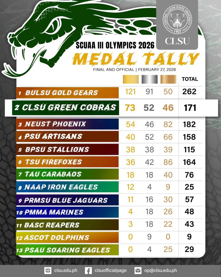The Central Luzon State University (CLSU) Green Cobras have once again proven their athletic strength after officially keeping its standing as the Overall 1st Runner-Up during the last day of the State Colleges and Universities Athletic Association (SCUAA) III Regional Games 2026. The Green Cobras delivered a strong performance across various sports, bagging a total of 171 medals: 73 Gold, 52 Silver, and 46 Bronze, highlighting their dedication, teamwork, and skills. During the closing ceremony held today, February 27, CLSU Sports Director Assoc. Prof. John A. Agaton officially received the trophy on behalf of University President Dr. Evaristo A. Abella. This victory belongs to the Green Cobras whose months of rigorous training, relentless perseverance, and passion-driven play fueled their triumphant journey to the podium. Sssslay, Green Cobras!