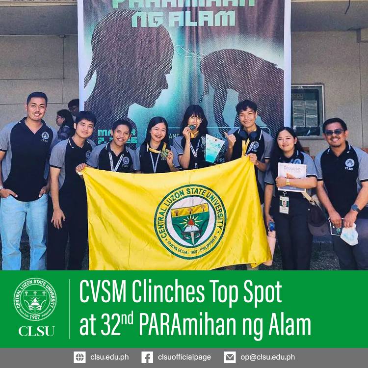 Central Luzon State University (CLSU), through the College of Veterinary Science and Medicine (CVSM), has once again proven its excellence in veterinary sciences, clinching the Championship title at the 32nd National PARAmihan ng Alam, organized by the UP Alpha Chiron Society (UPACS), held on March 7, 2026, at the University of the Philippines Los Baños (UPLB). Outshining 21 teams from 11 State Universities and Colleges (SUCs) across the country, the CLSU delegation secured the top spot, earning the P20,000 grand prize and a specialized kit of professional resources that solidifies its reputation as a powerhouse in veterinary parasitology. The championship-winning trio was composed of Ms. Dannah Jedidah G. Lucas, Ms. Krista M. Mendoza, and Mr. Mark Joedel U. Mendez. Other teams, featuring Allen Dave B. Serrano, Dan Carlo H. Crisostomo, and Lance Josef E. Landagan, also delivered a formidable performance. The expert mentorship of Dr. Katrina E. delos Reyes and Dr. Marvin Bryan S. Salinas guided both teams. CLSU placed ahead of other SUCs, with UPLB in second and De La Salle Araneta University in third, reinforcing CLSU’s status as a leader in veterinary education in the Philippines.