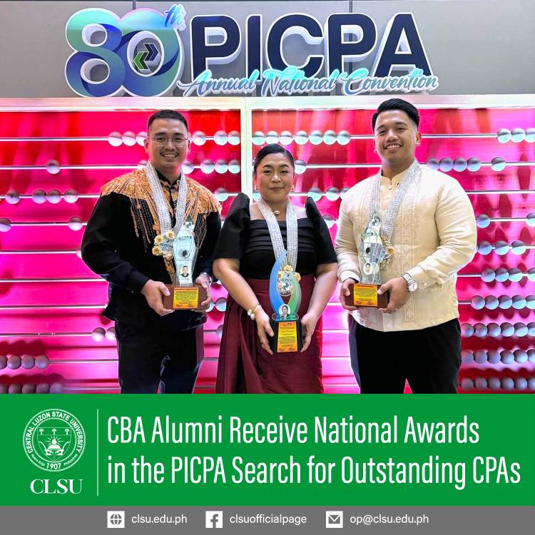 Alumni of Central Luzon State University (CLSU) are among this year’s National Awardees in the Philippine Institute of Certified Public Accountants (PICPA) Search for Outstanding CPAs, the most prestigious national recognition in the accountancy profession conferred by the national professional organization for CPAs in the Philippines. This annual search distinguishes CPAs who exemplify professional excellence, integrity, and service in their respective fields. The CBA alumni recognized as 2025 PICPA National Awardees are: 1. Assoc. Prof. Winnie DC. Villanueva - Outstanding PICPA Member 2. Mr. Allan Paul R. Gabriel - Young Achiever in Commerce and Industry 3. Mr. John Bertrand C. Gatchalian - Young Achiever in Government Service Their recognitions serve as a source of pride and inspiration across CLSU, reinforcing the University’s longstanding tradition of producing competent and service-driven professionals making contributions with national impact. CLSU extends its heartfelt congratulations to the awardees for bringing honor to the University and for upholding the highest ideals of the accountancy profession. #SievingForExcellence