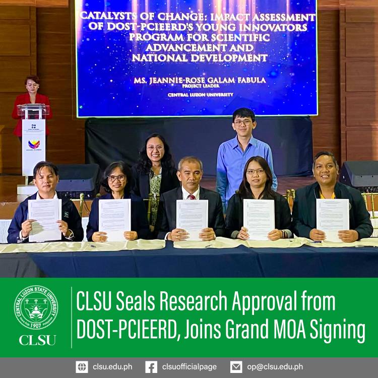 The Central Luzon State University (CLSU) joined the Department of Science and Technology-Philippine Council for Industry, Energy, and Emerging Technology Research and Development (DOST-PCIEERD) Grand Memorandum of Agreement (MOA) last December 11, 2025, at the DTI-PTTC Hall B in Pasay City, Manila after one of its research proposals was approved amounting to almost four million pesos. Dr. Jeannie-Rose G. Fabula of the Crops and Resources Research and Development Center (CRRDC), will serve as the project leader of the approved research titled “Catalysts of Change: Impact Assessment of DOST-PCIEERD’s Young Innovators Program (YIP) for Scientific Advancement and National Development.” The project, which will run from Janto December 2026, aims to evaluate the long-term impacts of the Young Innovators Program, a flagship initiative that supports young Filipino researchers in science, technology, and innovation. The findings will contribute to enhancing initiatives designed to nurture the country’s future innovators. A diverse team of faculty researchers, including Maria Celia M. Fernando, Jairus Jesse M. Tubal, Herald Kam G. Hernando, and Dr. Maria Excelsis M. Orden will be part of the said project. The MOA signing event was attended by DOST-PCIEERD officials and agency heads from various partner institutions. It also featured technical discussions on the commercialization of research and development through the Innovate PINAS program, as well as the launch of international partnerships with Spanish research agencies. Dr. Fabula was accompanied by Dr. Jonathan V. Fabula, who represented the university president, Dr. Evaristo A. Abella, during the said event. This involvement underscores CLSU’s commitment to research excellence and its essential role in fostering a strong and inclusive science and technology ecosystem for national development.