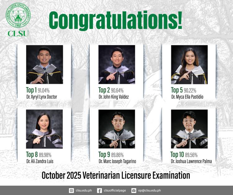 The Central Luzon State University (CLSU) through its College of Veterinary Science and Medicine (CVSM) once again proved its elite standing in veterinary education, producing six topnotchers in the recent Veterinarians Computer-Based Licensure Examination. Leading this triumphant group is Dr. Xyryl Lynx Doctor, who seized the coveted Rank 1 spot with an exemplary rating of 91.04% bringing significant pride to the university. Dr. Doctor was joined by Dr. John King U. Valdez with 90.64% (Rank 2), Dr. Myca Ella S. Pastidio with 90.22% (Rank 5), Dr. Ali Zandra P. Luis with 89.98% (Rank 8 ), Dr. Marc Joseph S. Tagarino with 89.86% (Rank 9), and Dr. Joshua Lawrence G. Palma with 89.56% (Rank 10), completing the university's stunning dominance of the licensure exam's Top 10 roster. The 131 successful "Golden Grains" collectively showcased their brilliance, powering the University to achieve an outstanding 89.73% institutional passing rate and securing the rank of the Second Top Performing School nationwide with 100 or more examinees. The University Administration extends its warmest congratulations to the new veterinarians, their proud parents, and the dedicated faculty and staff of the CVSM for their relentless commitment to excellence. Congratulations to all our new Veterinary Doctors! List of passers: 1. Dr. Bryle Allen Abad 2. Dr. Bryan Anthony Abanilla 3. Dr. Gwyneth Abrigo 4. Dr. Daisy Acuña 5. Dr. Coleen Jazmin Adao 6. Dr. Angelo Bien Adviento 7. Dr. Ian Lorenzo Aguilar 8. Dr. Gellie Ann Aguinaldo 9. Dr. Julienne Alexandra Agustin 10. Dr. Lemoel John Agustin 11. Dr. Shaina Lyka Agustin 12. Dr. Ivy Marie Alfaro 13. Dr. Poiein Andrada 14. Dr. Jeshua Antonio 15. Dr. Ronald Francis Aquino 16. Dr. Angelika Marie Aquitania 17. Dr. Jade Ariston 18. Dr. Roschelle Van Aum 19. Dr. Joshua Avellanoza 20. Dr. Princess Queennie Babas 21. Dr. Jericho Baguistan 22. Dr. Anna Marie Balaca 23. Dr. Danica Mae Baltazar 24. Dr. Aza Lea Anne Barbosa 25. Dr. Ma. Andrea Nicolle Barrientos 26. Dr. Jonah Louise Batungbacal 27. Dr. Shaira Flor Bautista 28. Dr. Christian Bauto 29. Dr. Zharina Beltran 30. Dr. Patrick Bernabe 31. Dr. Judith Bince 32. Dr. Darrel Briones 33. Dr. Lordjay Nolie Bueno 34. Dr. Kaycee Joline Cabral 35. Dr. Hannah Joy Cadiz 36. Dr. William Arthur Calica 37. Dr. Deidrey Camua 38. Dr. Rhyniel Josh Canta 39. Dr. Francis Nathan Capule 40. Dr. Edmon Capuno 41. Dr. Carmela Flor Carbonel 42. Dr. Eric Oliver Catausan 43. Dr. Dorothy Joy Cruz 44. Dr. Aaron Nichol Dacumos 45. Dr. Alyanna De Guzman 46. Dr. Darlene Grace De Guzman 47. Dr. Hannah De La Rosa 48. Dr. Rogelyn De Leon 49. Dr. Krisceline De Vera 50. Dr. Ana Isabel Del Rosario 51. Dr. Dannah Elida Dela Cruz 52. Dr. Leann Mae Dela Cruz 53. Dr. Zuriel Gabe Dela Fuente 54. Dr. Katrina Delos Reyes 55. Dr. Vhon Wilmer Destor 56. Dr. Xyryl Lynx Doctor 57. Dr. Elaine Duazo 58. Dr. Vincent Giego Dumael 59. Dr. Drexter Escobar 60. Dr. Marielle Esporna 61. Dr. Carl Joshua Fernando 62. Dr. Mei Kathleen Floresca 63. Dr. Angela Joy Gaffud 64. Dr. Alethea Luz Garcia 65. Dr. Gene Andrei Garcia 66. Dr. Juliane Gale Geraldizo 67. Dr. Marie France Gijapon 68. Dr. Florence Gay Gutierrez 69. Dr. Heinrique Dave Aloysius Ibasco 70. Dr. Kaye Neil Ignacio 71. Dr. Katrece Gabrielle Jaime 72. Dr. Jan Mariella Juliano 73. Dr. Martina Alessandra Lalin 74. Dr. Ryan Mikel Lanting 75. Dr. Kenneth Liao 76. Dr. Ali Zandra Luis 77. Dr. Samuel Mababa 78. Dr. Edwin Jr. Macabante 79. Dr. Ryan Maducdoc 80. Dr. Edsel John Magtoto 81. Dr. Jimuel Malaca 82. Dr. Maria Noriza Mallari 83. Dr. Peter Kyle Maloco 84. Dr. John Marius Mamaril 85. Dr. Kayeleen Mangugan 86. Dr. Justine Patrick Marmol 87. Dr. Alliester Mike Marquez 88. Dr. Nicole Rose Martin 89. Dr. Albert Christian Martizano 90. Dr. Angelika Mateo 91. Dr. Claudia Isabella Mendoza 92. Dr. Angelica Munar 93. Dr. Joshua Ryan Mungcal 94. Dr. Irish Eugene Ong 95. Dr. Jernina Angellette Padiernos 96. Dr. Joshua Lawrence Palma 97. Dr. Reynaliza Jane Pascual 98. Dr. Myca Ella Pastidio 99. Dr. Evander Perez 100. Dr. Eunice Peria 101. Dr. Reanne Mikaela Pineda 102. Dr. Ana Shiela Pinuela 103. Dr. Yessamin Polintan 104. Dr. May Regine Puno 105. Dr. Dixie Mei Ramirez 106. Dr. Wayne John Ramos 107. Dr. Kristine Ranches 108. Dr. Nicole Rovillos 109. Dr. Kenji Sab 110. Dr. Daryl Kate Sagun 111. Dr. Maricon San Jose 112. Dr. Marlon Sanchez 113. Dr. Rica Mae Sol 114. Dr. Marc Robert Soriano 115. Dr. Maricel Soriano 116. Dr. Leanne Joyce Sta. Maria 117. Dr. Mikhaela Bernadette Sumabat 118. Dr. Marc Joseph Tagarino 119. Dr. Clarice Tagasa 120. Dr. Jazzlyn Tamayo 121. Dr. Jan Marinni Tan 122. Dr. Anne Auldwyne Timenia 123. Dr. Faith Dianne Tobias 124. Dr. John Andreu Tolentino 125. Dr. Mark Daniel Traballo 126. Dr. Michelle Tumali 127. Dr. Andrea Ulatan 128. Dr. Dennise Zyna Mae Uy 129. Dr. John King Valdez 130. Dr. Donalyn Vigilia 131. Dr. Geanne Magdelaine Villanueva #SievingForExcellence